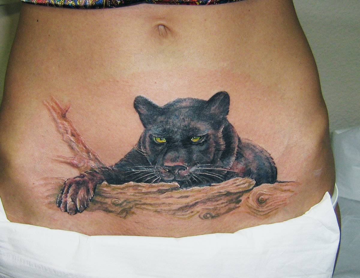 Помимо этого тату внизу живота выполняют поверх рубцов после операций или кесарево сечения.
