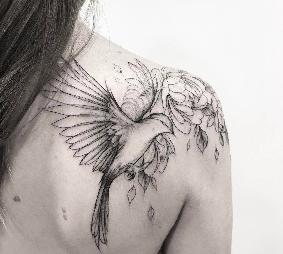 Эта категория изображений занимает почетное место в галерее художника. Опытный мастер непременно подскажет, какой рисунок будет смотреться наиболее гармонично. В любом случае изображение птичьей стаи, улетающей вдаль, всегда смотрится изысканно на хрупком женском теле. Интересно, но именно после нанесения рисунка в гардеробе у женщины появляются вещи, которые как бы невзначай оголяют плечо, подчеркивая всю красоту татуировки.