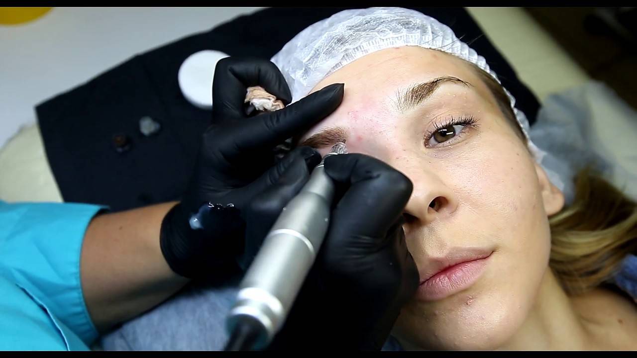 - Проводится главная часть операции – напыление пигмента под кожу вокруг бровей с использованием профессиональной техники, который постепенно формирует чёткий контур, повторяя линии, начерченные при выполнении эскиза. Данная процедура, как правило, в опытных руках занимает от 30 до 45 минут, однако, если косметологу необходимо обработать большую площадь, то процесс немного затягивается.