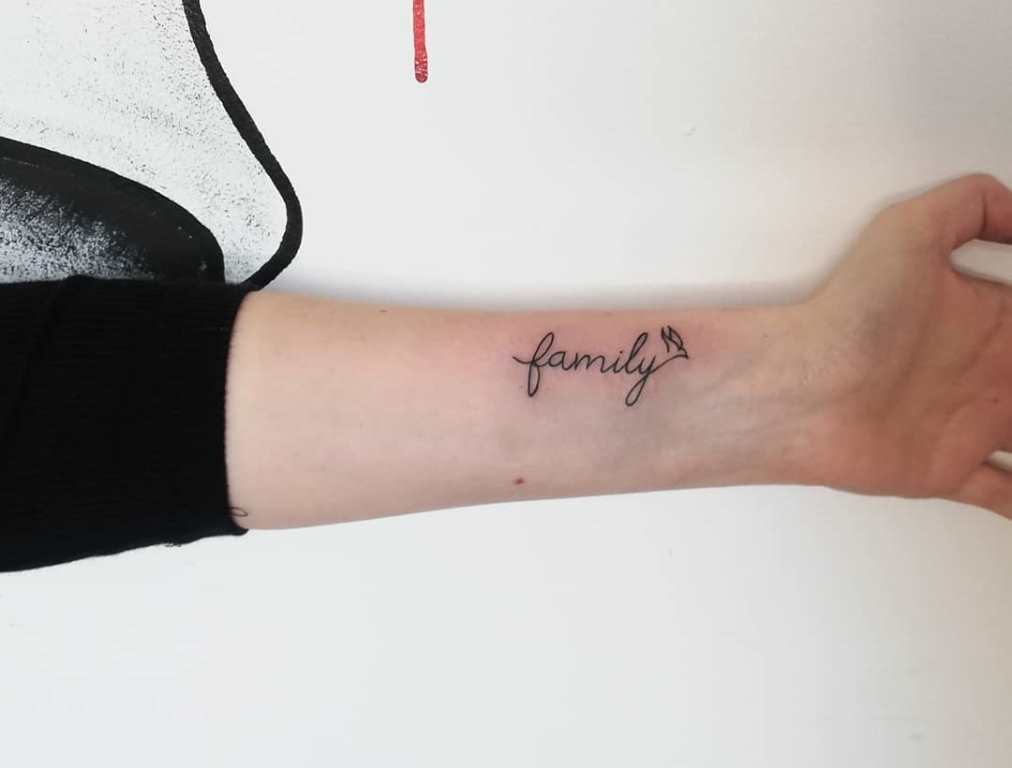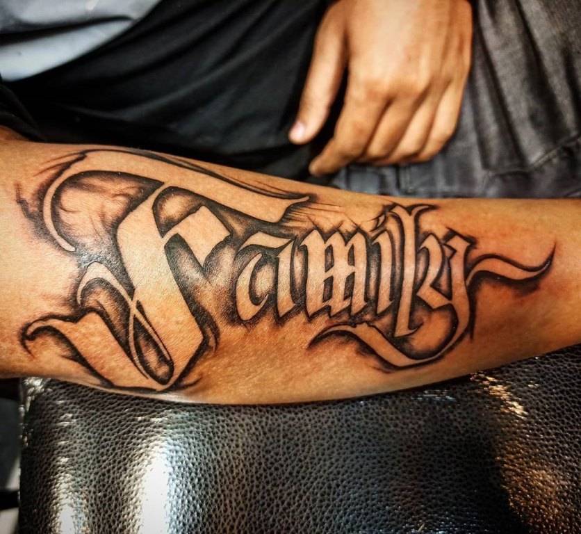 Многие мужчины и женщины выбирают простое, но значимое слово – «Family». Как правило, парни набивают его в стиле чикано, а девушки предпочитают минимализм.