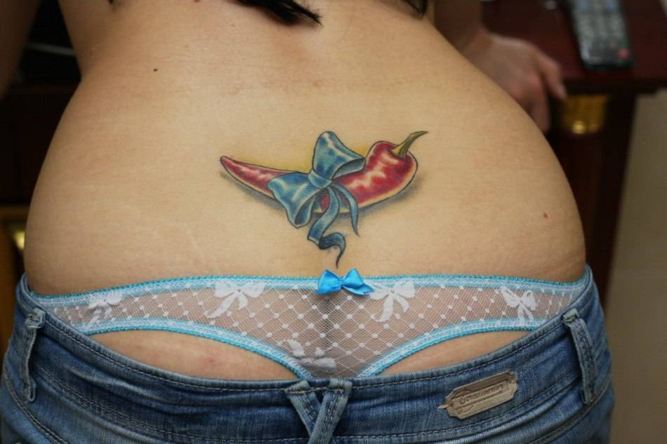 — достаточно интересный вариант для так называемой «золотой середины». Это значит, что изображение можно при желании легко скрыть, но при подборе правильной одежды оно будет интриговать окружающих. На пояснице татуировки делают часто, особенно девушки смелые и кокетливые.
